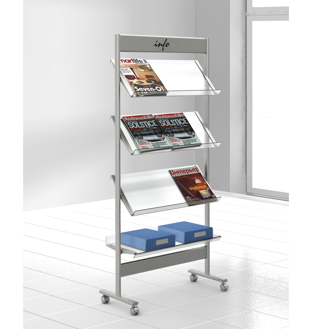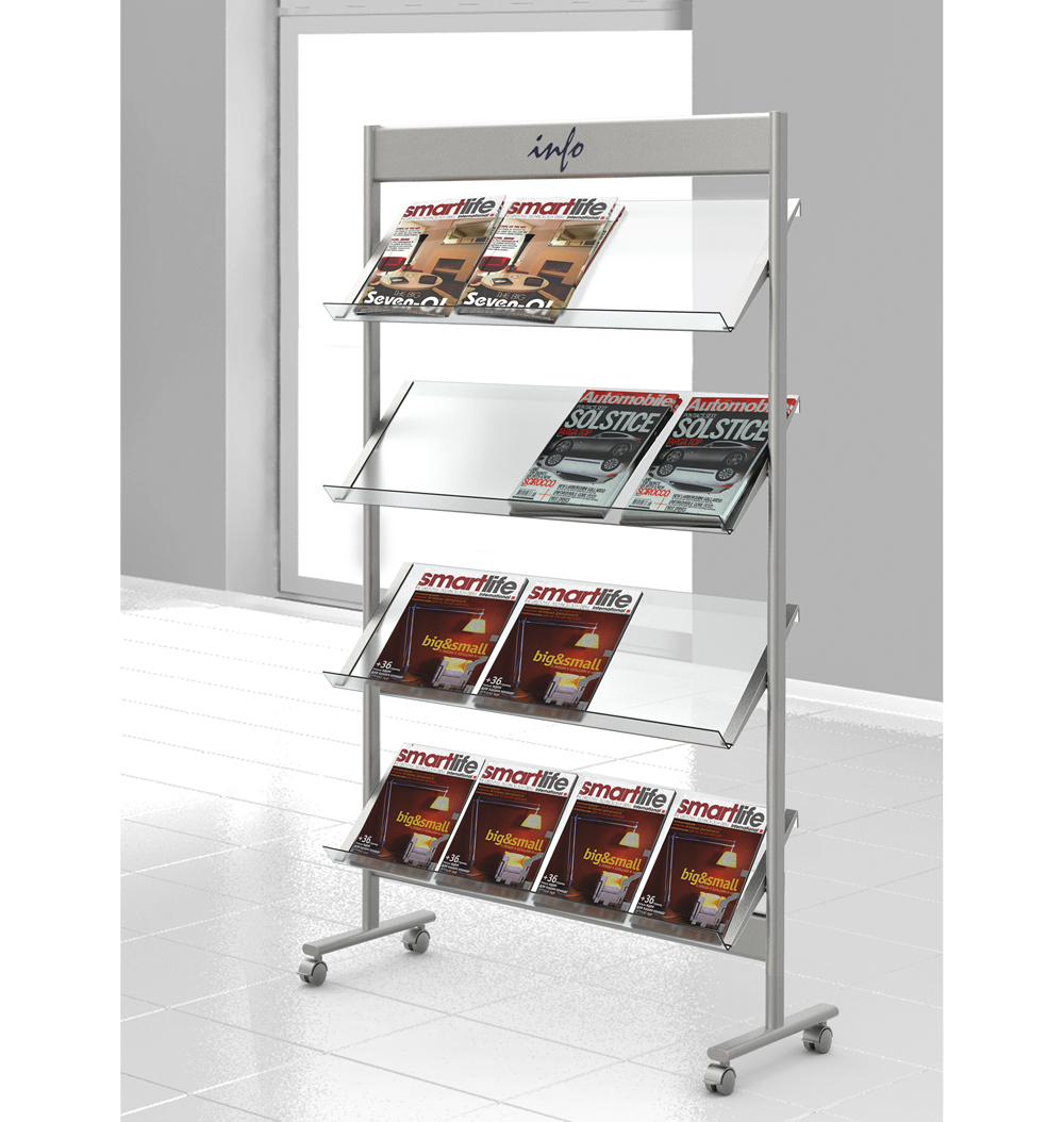 Stabile Stahlkonstruktion aus Flachovalrohr mit einer 120 mm hohen Beschriftungsblende und vier Prospektböden aus Acrylglas mit einer 40 mm hohen Anschlagkante. Der jeweils untere Boden