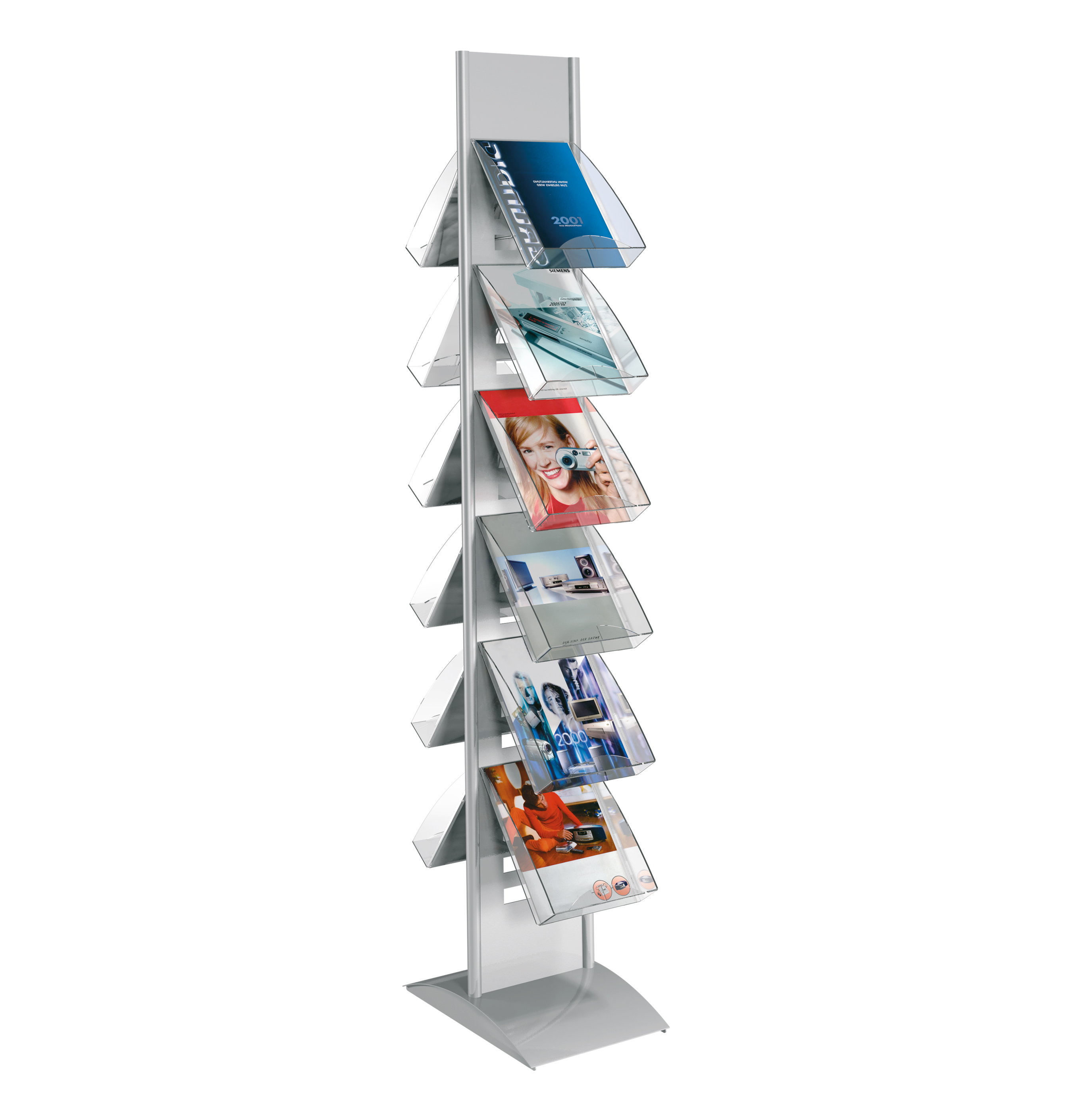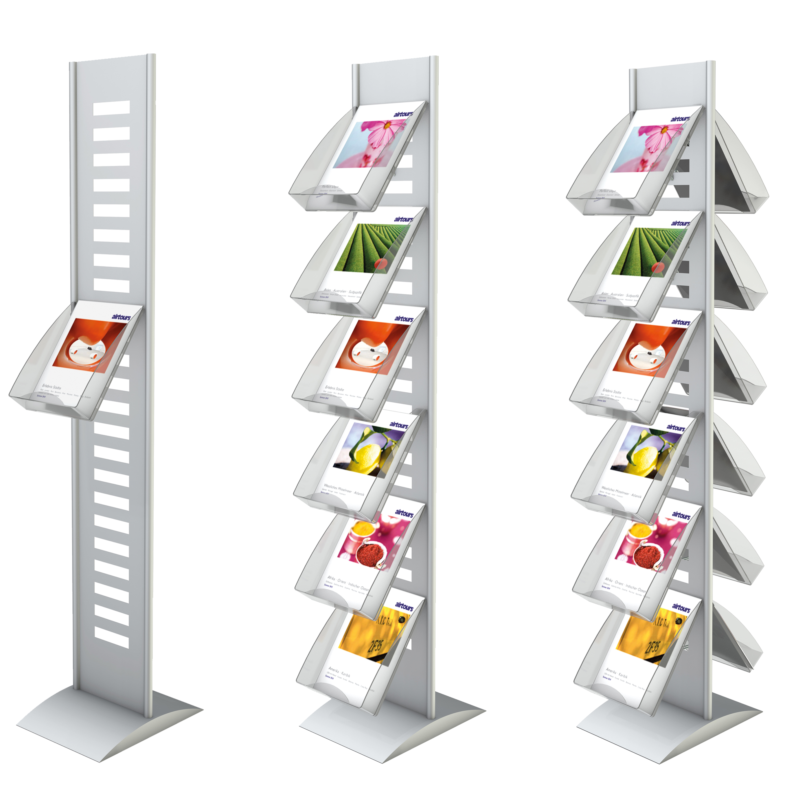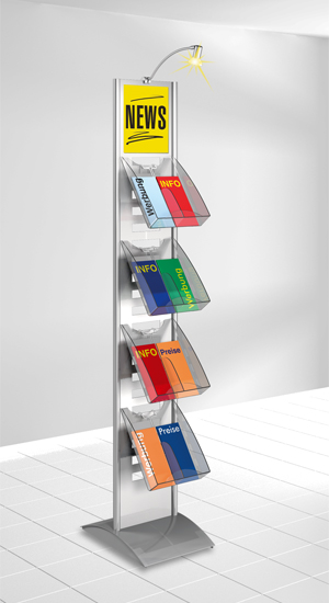 In jeden Ständer können bis zu 12 Prospektfächer (bei doppelseitiger Nutzung) eingesetzt werden. Die Prospektfächer nehmen entweder DIN A4-Prospekte oder in Verbindung mit einem Fachteiler (Art. 6942) DIN-lang-Prospekte auf. Des Weiteren gibt es ein Infoschild DIN A4 (mit einer leicht austauschbaren Beschriftung für Ihr individuelles Werbelogo).